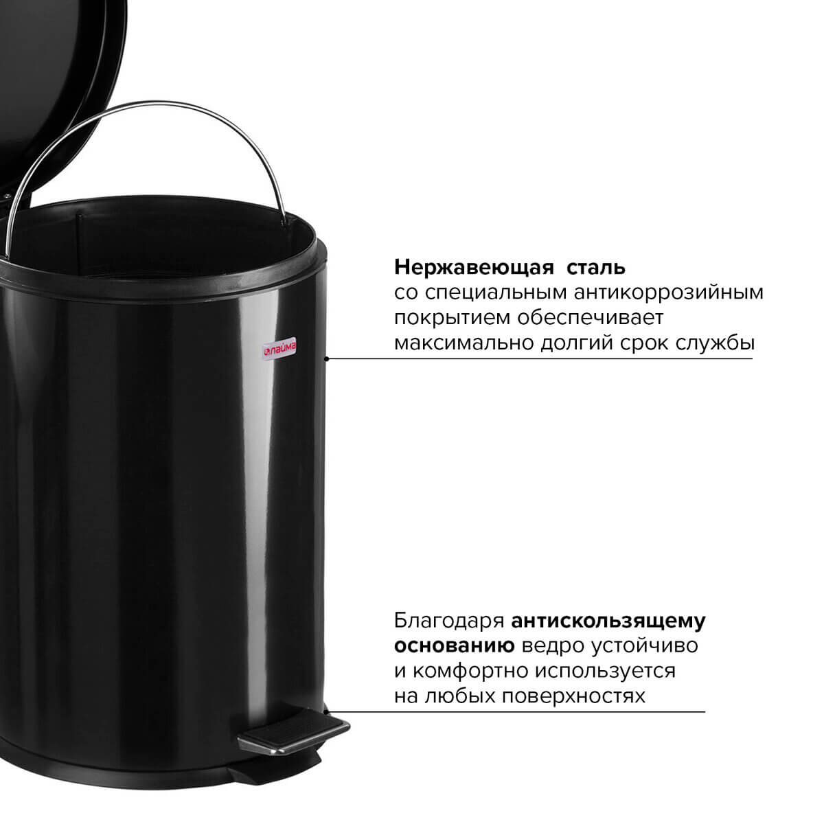 Ведро-контейнер для мусора (урна) с педалью LAIMA Classic, 20 л, черное, глянцевое, металл, со съемным внутренним ведром